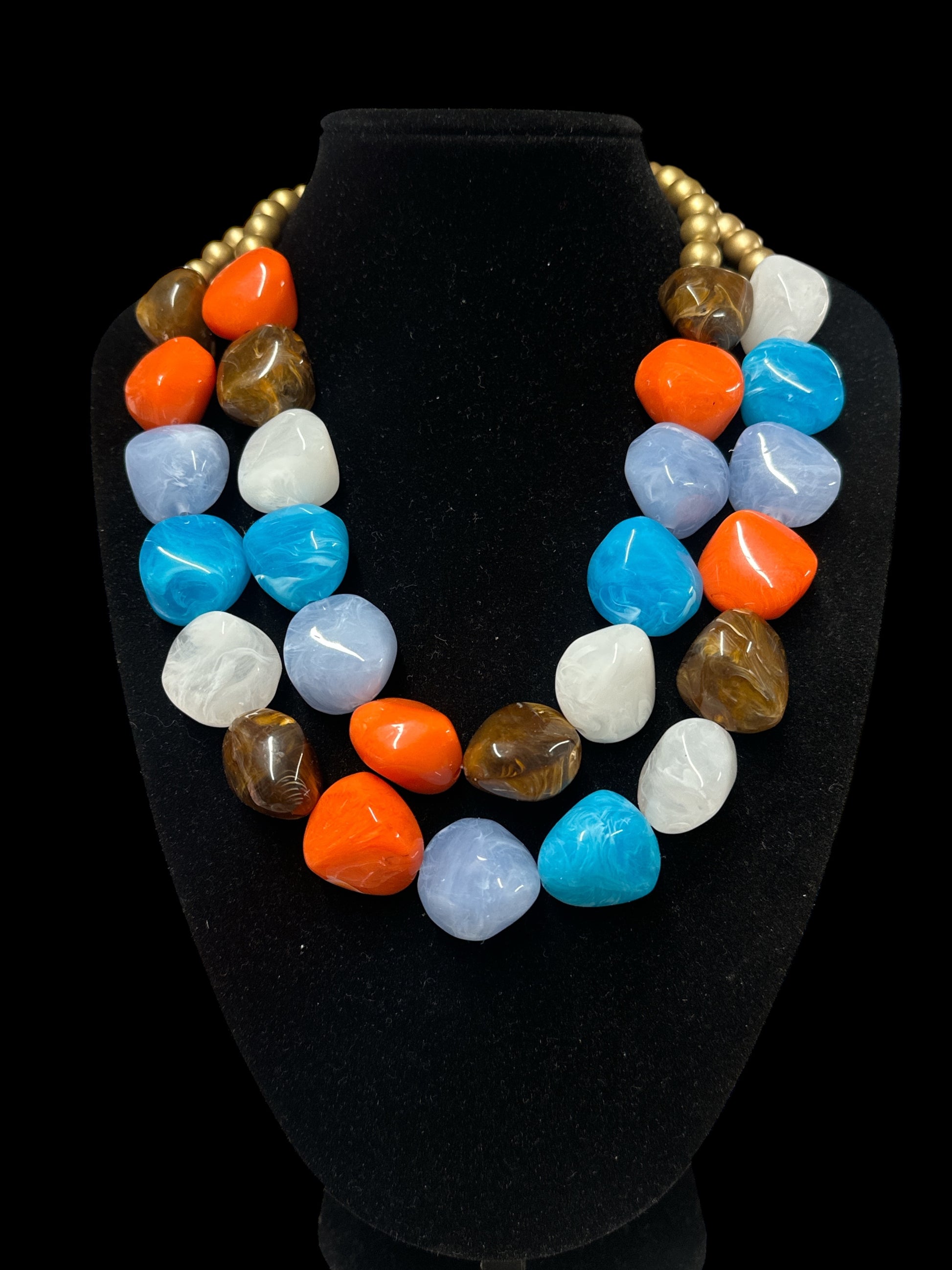 Add a burst of colour to your style with this stunning Chunky Multicoloured Resin Bead Necklace. Featuring large, polished resin beads in vibrant orange, blue, white, brown, and gold tones, this ethnic-inspired statement necklace is perfect for adding personality to any outfit. Its bold and artistic design makes it ideal for festivals, beach days, summer parties, or simply brightening up your everyday wear. Lightweight yet impactful, this bohemian necklace is a must-have for jewellery lovers.