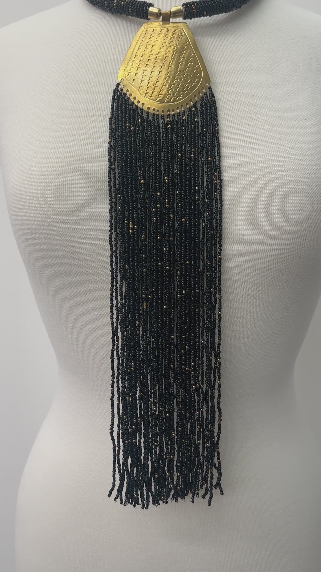 Long Authentic African Engraved Brass Black Beaded Fringe Pendant Necklace