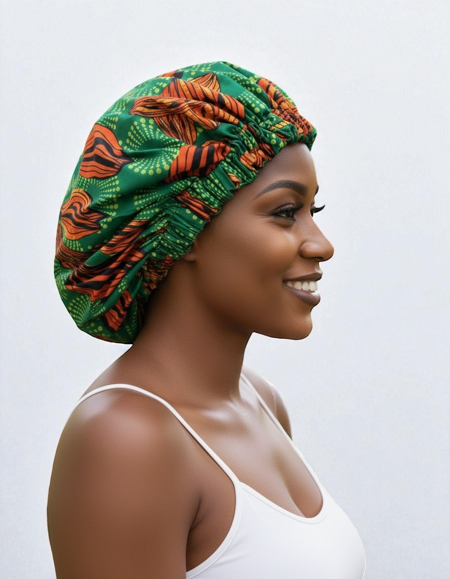 Protect your hair in style with this stunning double-layered Ankara satin bonnet cap. Featuring a bold green and orange African wax print exterior and a smooth green satin silk lining, this bonnet helps retain moisture, reduce frizz, and prevent breakage overnight. Designed with an elastic band for a secure fit, it's ideal for natural hair, braids, locs, curls, and protective styles. Perfect for sleeping or lounging in comfort and fashion.