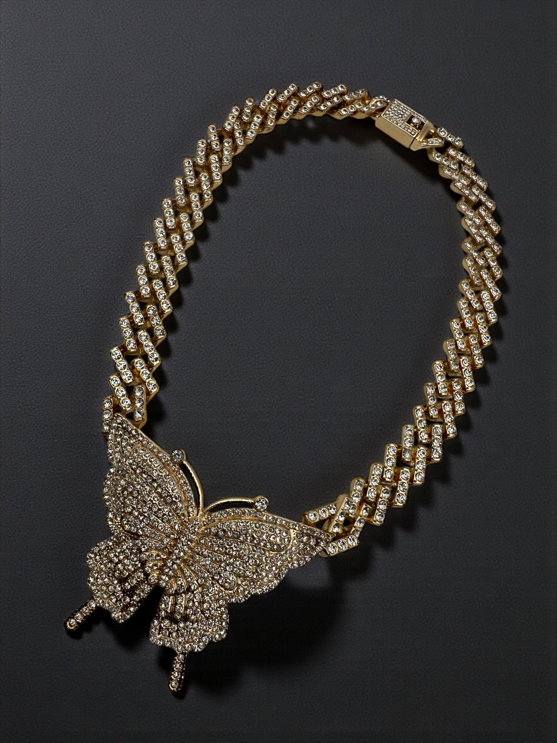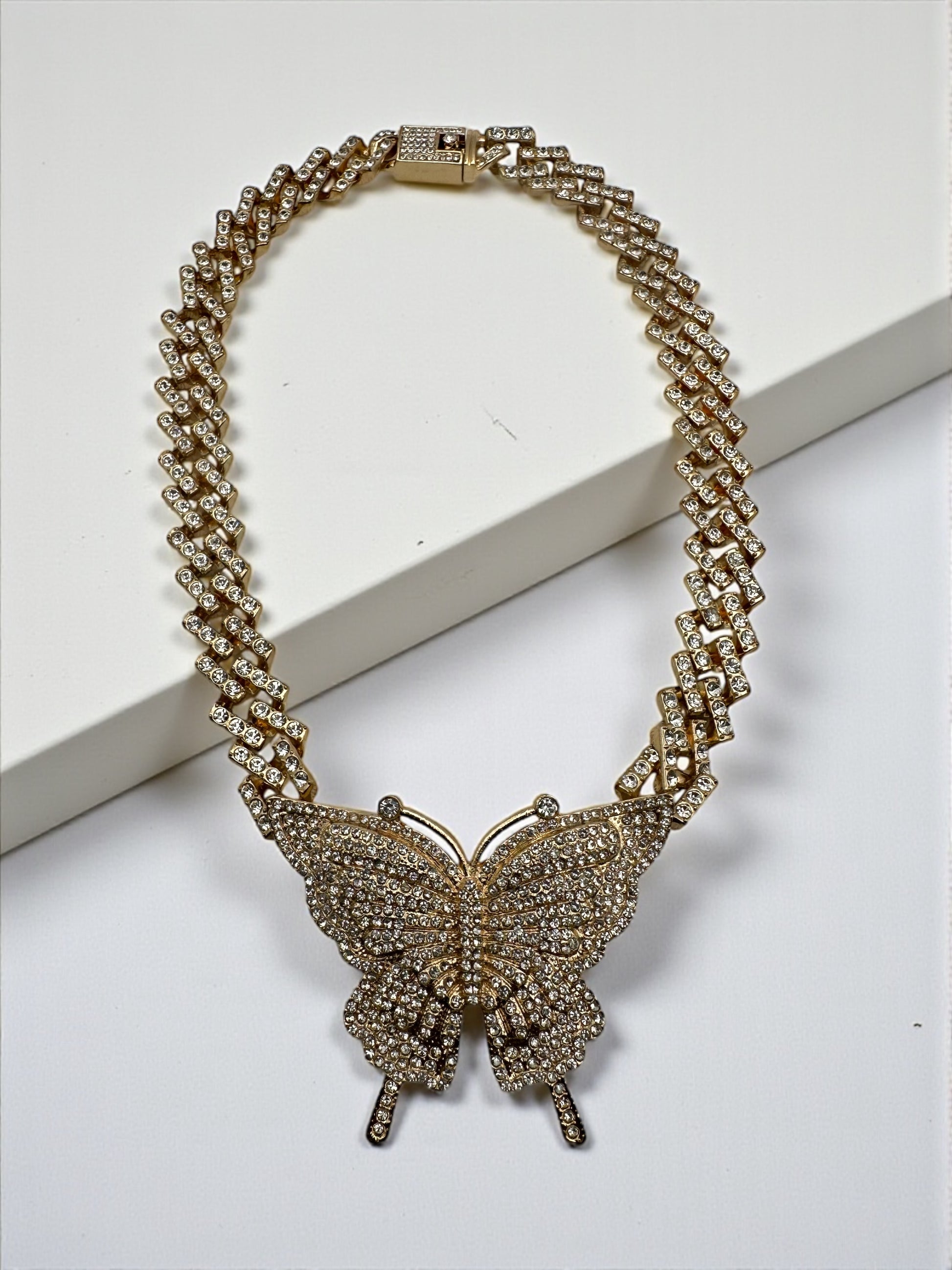 Elegant Rhinestone Cuban Butterfly Pendant Necklace – Sparkling Statement Jewellery in Gold & Silver