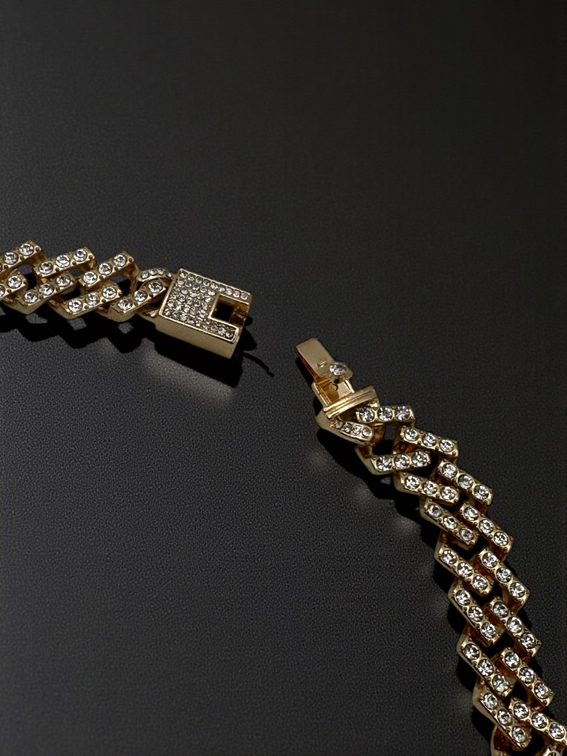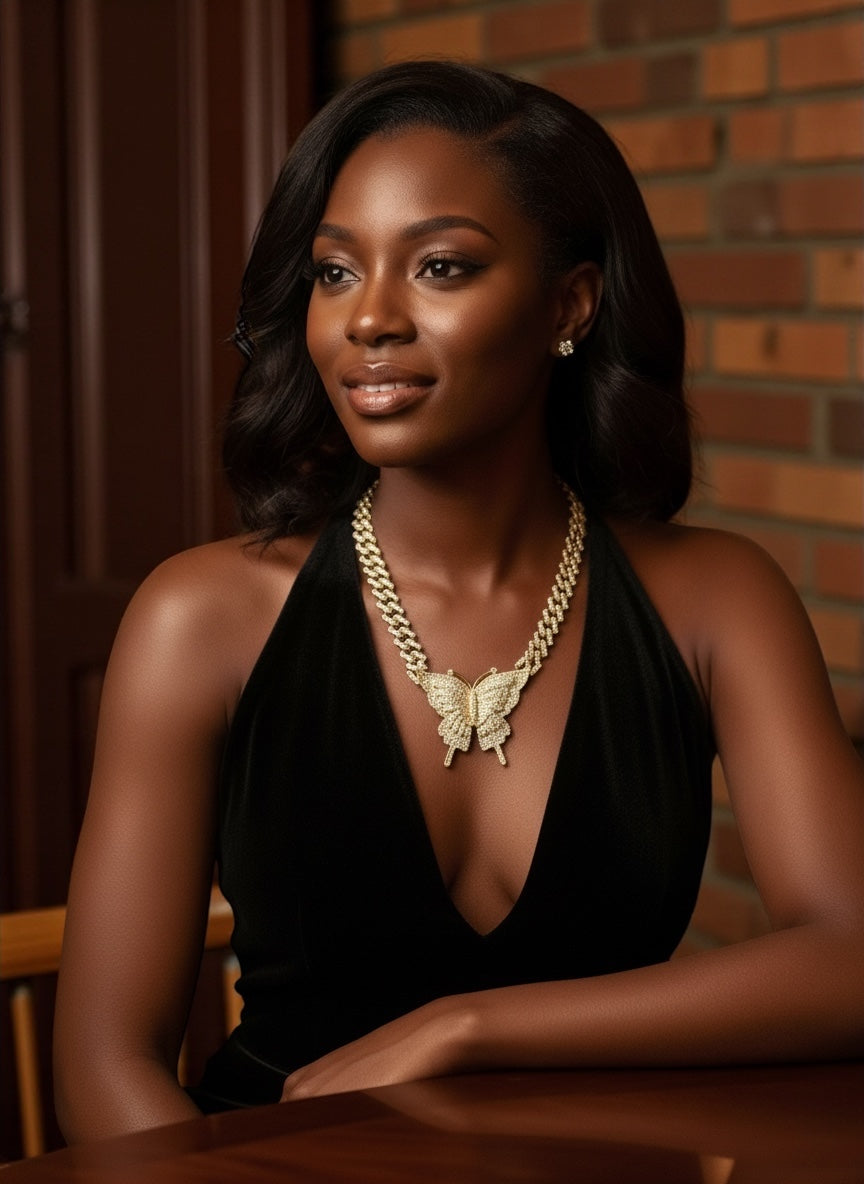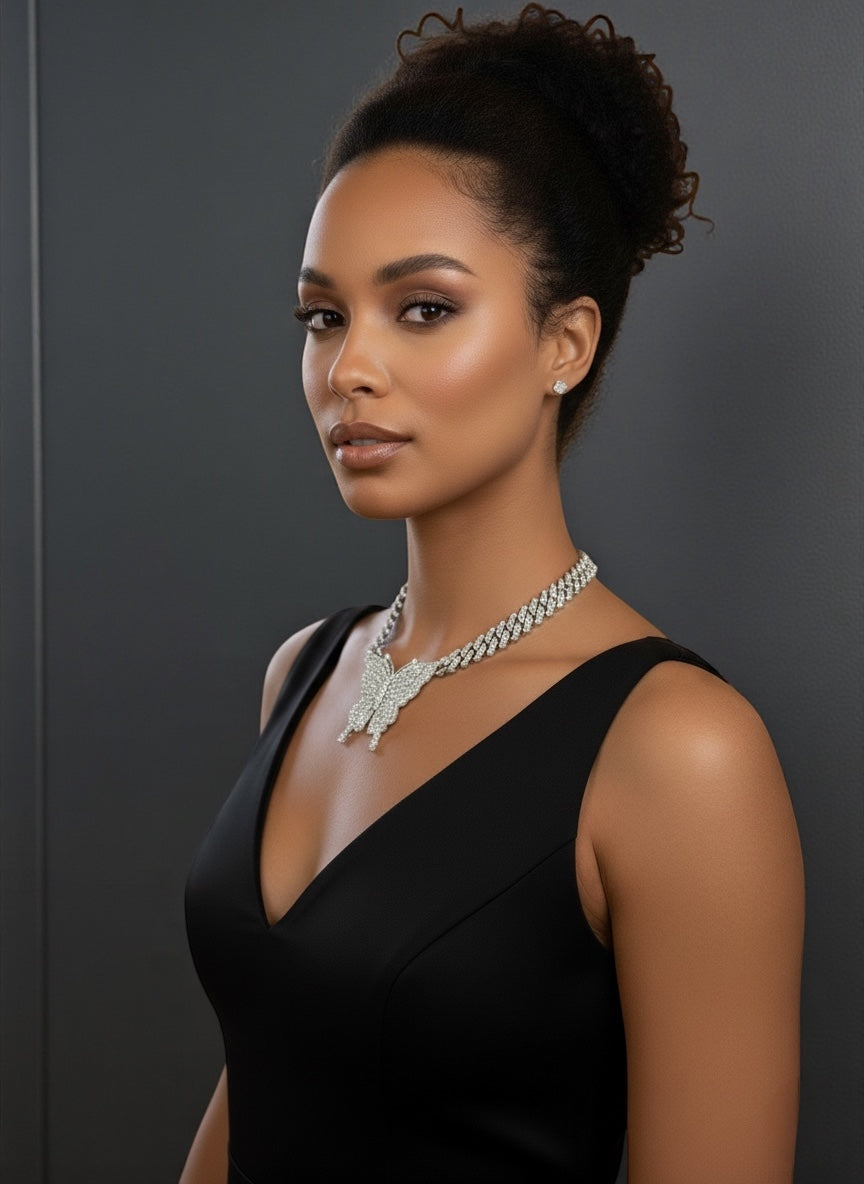 Make a striking impression with this exquisite rhinestone butterfly pendant necklace. Featuring a meticulously crafted butterfly adorned with sparkling crystals, this statement piece sits gracefully on a robust Cuban chain available in lustrous gold or silver finishes. Perfect for elevating evening wear, formal occasions, or adding glamorous flair to everyday styling, this necklace combines timeless elegance with contemporary sparkle. The bold pendant design catches light beautifully, creating an eye-catching focal point that complements both classic and modern aesthetics. An ideal choice for those seeking luxury jewellery that makes a confident statement, whether for a special celebration or as a treasured gift for someone extraordinary.