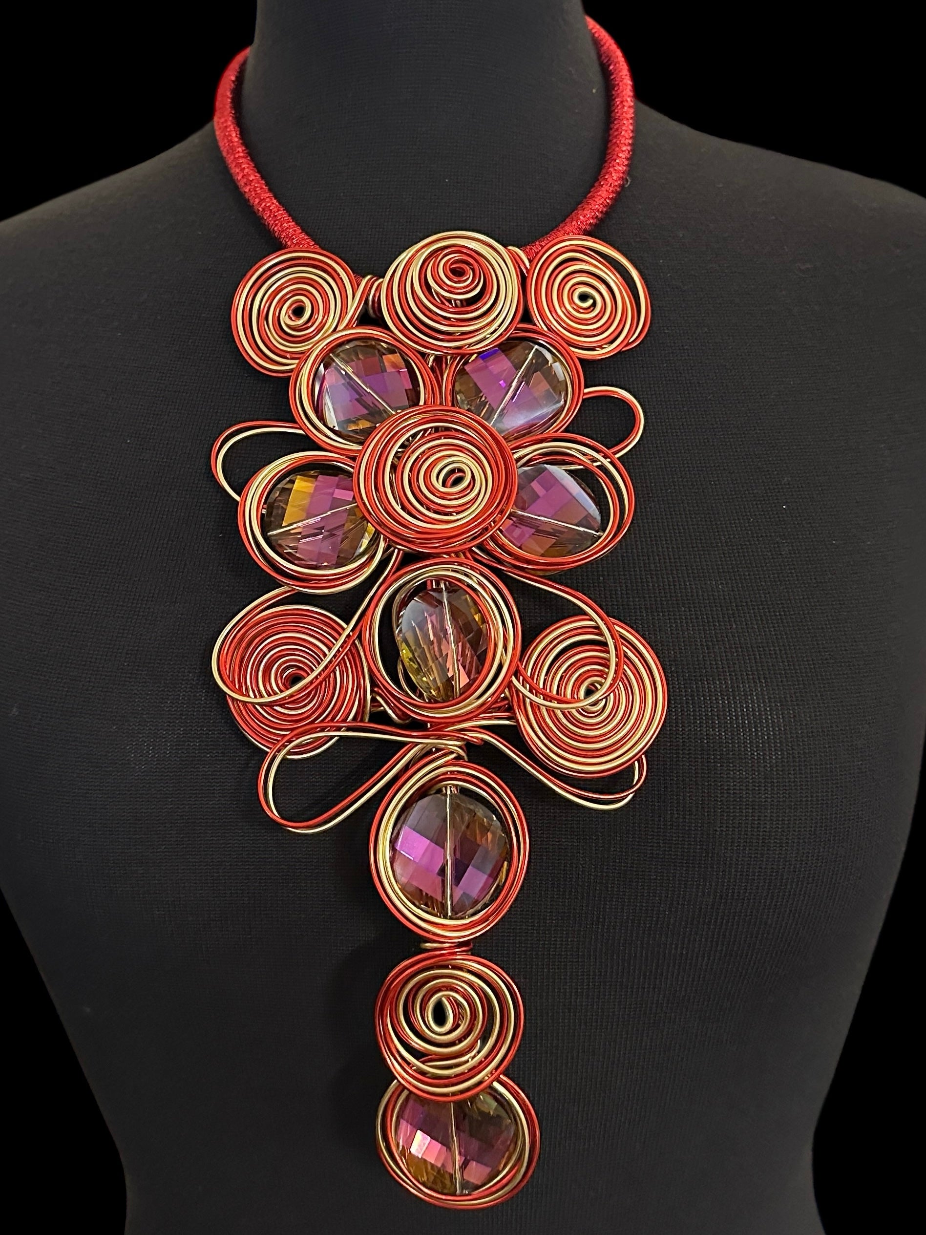 Make a powerful entrance with this handcrafted Red & Gold Spiral Wirework Crystal Statement Necklace Set, designed for women who love bold, artistic, high-impact jewellery. This dramatic piece features layered wire spirals, oversized faceted crystals in rich wine-purple tones, and a thick wrapped cord for an elevated finish.
